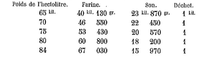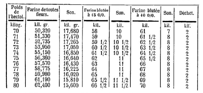 D’après un rapport fait au conseil municipal de Valence en 1845, il faut 440 litres de blé, moyenne qualité, pesant ensemble 334 kilogr., pour obtenir de la mouture économique, faite sans abus, 127 kilogr. de farine fleur et 123 kilogr. de farine grise, en tout 250 kilogr. ou deux balles de 125 kilogr. (c’est 50 kilogr. de farine par hectolitre.)