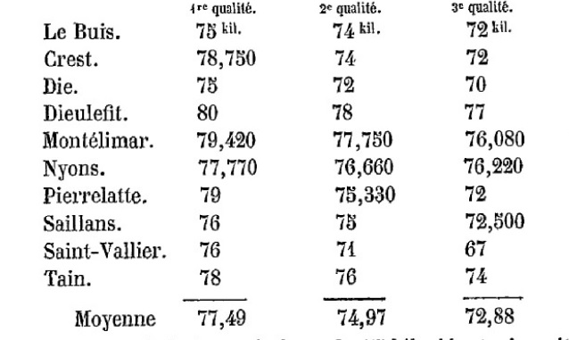 1° – Le poids de l’hectolitre de blé, constaté officiellement par trois épreuves, n’est pas encore bien connu pour 1867. Voici les résultats signalés jusqu’à ce jour :