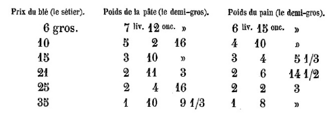 1° « La livre de pain blanc doit valoir autant de deniers que le sétier de blé, mesure de Paris, pesant 240 livres, poids de marc, compte de livres numéraires au marché. »