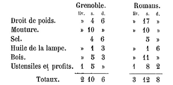 Or, pour plus de facilité, les experts, adoptant les calculs faits à Grenoble, se bornèrent à ajouter un sixième aux frais et profits des boulangers de Romans, à cause du sixième que pesait en plus le sétier de cette ville comparé au sétier de Grenoble.
