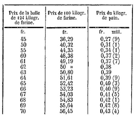 Partant de ces données, les commissaires établirent les chiffres suivants pour déterminer le poids de la pâte et du pain, d’après le prix du blé :