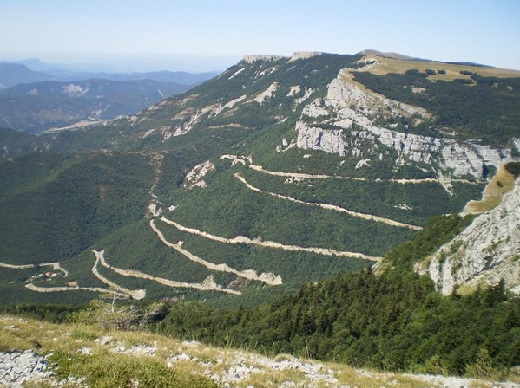 Des deux côtés de celle-ci, entre les tunnels, se dressent des rochers d’un gris bleuâtre, dépourvus de végétation, et qui, d’une hauteur d’abord considérable, diminuent successivement par suite de l’ascension de la route et de l’abaissement du sol supérieur. Celui-ci, en effet, dessine sérieusement sa proclivité (saillie en avant) vers le fond de la vallée du Vercors, dont on est sur le point d’atteindre le creux infime, d’où coule la rivière.