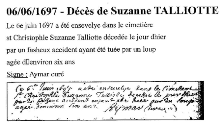 La dernière personne tuée par le loup à Aouste sur Sye et répertoriée sur les registres paroissiaux est une fillette de 6 ans tuée le 5 juin 1697 : Suzanne Talliotte