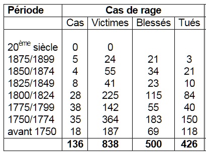 Forêt de Lorges (Cotes d « Armor). Le 25 avril 1851, en 7 heures de temps, un loup se déplaça sur 45 km, traversant 9 villages et mordant 41 personnes (10 hommes, 12 femmes et 19 enfants), 96 animaux (64 bovins, 14 chevaux, 8 moutons, 6 porcs, 3 chèvres et 1 chien). 14 personnes moururent de la rage dans les 2 mois suivant; il est probable que la plupart des autres moururent également. Ce fait repose sur les rapports historiques rédigés par le maire de Pleisdy, l’hôpital local, un rapport de police et une lettre d’un des ministres du gouvernement de l’époque (de Beaufort-1987).