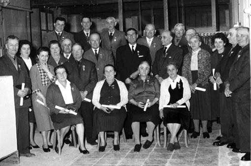 Remise de la médaille du travail en 1960 : de gauche à droite, au premier rang : Marie Louise Gontier, Mme André Blache, Mme Adrien Pinet, Léone Breysse ; au second rang : Firmin Cluze, Yvonne Gagnaire, Yvonne Prudhomme, Simone Blache, Adrien Pinet, Gabriel Blache, Louis Gronlier, Jean Latune, Pierre Gourdol, Mme Jules Granon, Annie Brun, Gabriel Raillon, Paul Ferrier ; au troisième rang : Paul Chabus, Henri Blache, Jules Granon, Henri Gronlier, Emile Beranger, Gabriel Blache.