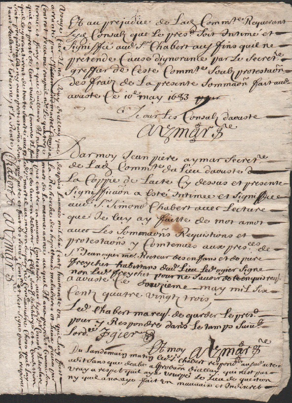 « Par moi Jean Pierre Aymar secrétaire de la dite communauté du lieu d’Aouste , la copie de l’acte ci dessus et présente signification a été intimée et signifiée au sr Simon Chabert avec lecture que je lui ai faite de mot à mot avec les sommations , réquisitions et protestations y contenues aux présences de sr Jean Ogier maître recteur des enfants et de Pierre Freychet habitants du dit lieu , le dit Ogier signe non le dit Freychet pour ne savoir de ce enquis et requis, à Aouste le douzième mai mil six cent quatre vingt trois.