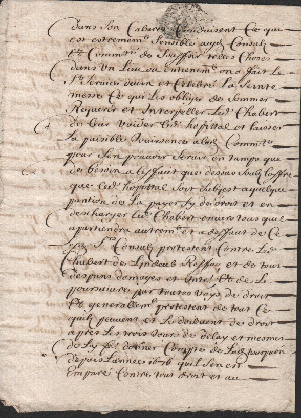 « Du lendemain matin le dit sr Chabert répondant au susdit acte a dit sans que (…..?) à l’approbation de celui-ci qu’il n’est pas vrai , a répété qu’il ait usurpé le lieu en question ni qu’il n’en ait fait un mauvais et indiscret usage car il n’a joui de celui-ci que depuis l’année 1681 qu’il lui fut arrenté par sr Estienne Martel commis à la recherche des hôpitaux, maladières et lieux pieux par contrat reçu par Maître Raspail le 14 mars de la même année auquel il en a payé la rente et comme son terme et fini et que d’ailleurs il ne veut pas entrer en aucune contestation avec les dits srs consuls il déclare qu’il est prêt de leur vider comme il fait et de leur en délivrer la clé sauf décharge et à condition qu’ils le garantiront de toute sauveté avec le dit sr Martel au moyen de quoi ne consent aucune chose qu’il lui soit préjudiciable ni aux protestations dont au dit acte et fait les siennes contestations et s’est signé pour sa réponse tant seulement. »