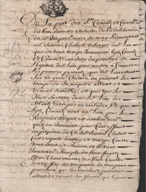 « De la part des sieurs consuls et communauté du lieu d’Aouste ensuite ce la délibération du 10° du présent mois de mai, remontrent à Sr Simon Chabert boulanger du dit lieu que de tout temps immémorial les dits consuls et communauté ont joui du privilège de l’hôpital du dit lieu pour mettre à couvert les pauvres passants , que le dit lieu étant sur le Grand Chemin où passent les troupes de sa Majesté allant et venant d’Italie, et que tous les jours s’arrêtent dans le dit lieu des soldats estropiés ou malades, et que les dits consuls n’ont autre lieu pour les reposer, et qu’il est absolument nécessaire qu’ils en jouissent pour cet effet au préjudice de ce , le dit Simon Chabert s’est emparé de celui-ci et usurpé contre tout droit et raison et le tient incessamment rempli de bois , fagots et autres choses, même y a fait coucher diverses fois des troupeaux de pourceaux que les marchands « pourcatiers » (porchers) allant et venant des foires qui logent dans son cabaret conduisent , ce qui est extrêmement sensible aux dits consuls et communauté de souffrir telles choses dans un lieu où entièrement on a fait le saint service divin et célébré la sainte messe, ce qui les oblige de sommer , requérir et interpeller le dit Chabert de leur vider le dit hôpital et laisser la paisible jouissance à la dite communauté pour s’en pouvoir servir en tant que de besoin à l’effet que dessus sous l’offre que le dit hôpital soit sujet à quelque pension de la payer si de droit et en décharger le dit Chabert envers tout ce qu’il appartiendra, autrement et à défaut de ce les dits sieurs consuls protestent contre le dit Chabert de l’indu refus et de tous dépens, dommages et intérêts et de le poursuivre par toutes voies de droit et généralement protestent de tout ce qu’ils peuvent et le doivent de droit après les trois jours de délai et même et de lui faire donner compte de la dite usurpation depuis l’année 1676 qu’il s’en est emparé contre tout droit et au préjudice de la dite communauté. Requérant les dits consuls que le présent soit intimé et signifié au dit sr Chabert, aux fins qu’il ne prétende cause d’ignorance, par le secrétaire greffier de cette communauté sous protestation des frais de la présente sommation , fait au dit Aouste ce 10 mai 1683.»