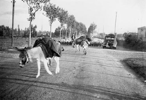 En tête de la colonne, les ânes marchaient, pesamment chargés des ustensiles de cuisiné et du matériel de campement. Ensuite, s’avançaient les vieux boucs, avec leurs grandes cornes et leurs longues barbes; ils portaient haut la tête, faisaient sonner en cadence leurs clochettes, et, parfaitement convaincus de leur importance, ne regardaient personne le long des chemins. Puis, venaient les chèvres et les jeunes boucs. Puis, les béliers à tête vénérable; enfin, l’immense multitude des brebis et des moutons, chacun portant un signe cabalistique sur sa toison noire et dure comme une carapace de tortue. De loin en loin, dominant la foule des animaux, les pâtres, colonels ou généraux de cette armée, cheminaient d’un pas lent et grave, armés de leur bâton noueux. De loin en loin aussi marchait un âne porteur de grandes mannes d’osier, desquelles émergeaient les têtes un peu effarées, mignonnes ; et gracieuses, des agneaux nouveau-nés ; les mères formaient tout autour un tumultueux cortège répondant par des bêlements caressants et anxieux aux plaintes chevrotantes de leurs petits.