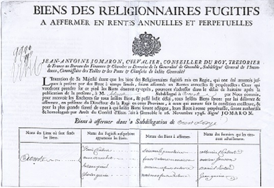 1746 : Jean Antoine Jomaron Conseiller du Roy et trésorier de France à Grenoble fait « apposer à la porte de l’église paroissiale d’Aouste », une « affiche indiquant les biens des religionnaires fugitifs à affermer », 4 noms y figurent : Pierre Chabert, Anne Brachet, Suzanne Point, Charles Guerin. (annexes 1 et 4)