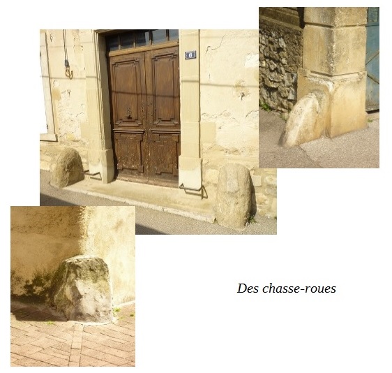 Si vous observez les angles de certaines rues, au sol, vous voyez la présence de « chasse-roues » évitant la détérioration du bâtiment par les roues de charrettes et tombereaux.