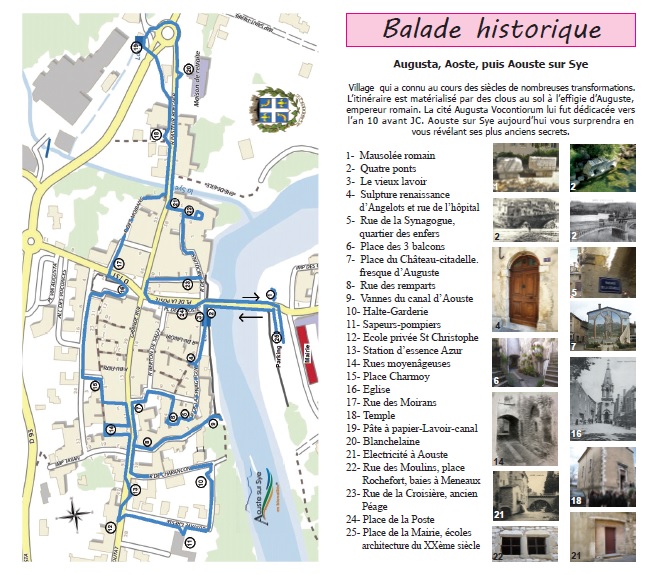 Bienvenue à Aouste-sur-Sye, bienvenue pour une approche de l’histoire locale! Au centre-village, découvrez une cité millénaire guidés par 26 panonceaux explicatifs et par des clous de voirie à l’effigie de l’empereur Auguste. La cité gallo romaine lui fut dédiée.