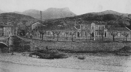 Devant ce bâtiment, mairie-école, une esplanade a été édifiée au début du XXeme siècle en surélévation par rapport à la Drôme. Elle correspond aux aménagements urbains de cette époque, c’est une promenade ombragée, avec des bancs et vision dominante sur la rivière ; c’est un lieu de sociabilité informelle à l’extérieur de l’ancienne cité, un espace éloigné des cafés et le reflet des préoccupations hygiénistes de lutte contre l’alcoolisme.