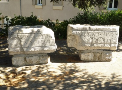 Sur une tablette, conservée au musée Calvet d’Avignon, l’extrait d’une inscription en latin « Au nom du Christ, ici repose Ampelius, fidèle serviteur de Dieu et Singénia, qui ont vécu dans l’affection conjugale et la tendresse, 70 ans (?) environ, et sont demeurés tout ce temps dans la paix du Seigneur. Telle fut la pureté de leur vie que durant plus de 20 ans, l’épouse étrangère à son mari, persista dans l’observance d’une continuelle chasteté. Ampelius, de vénérable mémoire, est mort le 16 des calendes de décembre (16 novembre), sous le consulat de Festus et Marcianus. Singénia, de bon souvenir, a trépassé le 6 des calendes de janvier (25 décembre) l’année après le consulat de Victor » (472 ?).