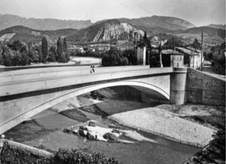 Seconde passerelle provisoire sur la rivière de la Drôme, après la destruction du pont métallique, le 24 juin 1940, par les troupes françaises pour stopper l’avancée de l’armée allemande. La première passerelle construite face à la rue des Remparts a été emportée par une crue de la Drôme en octobre 1940.