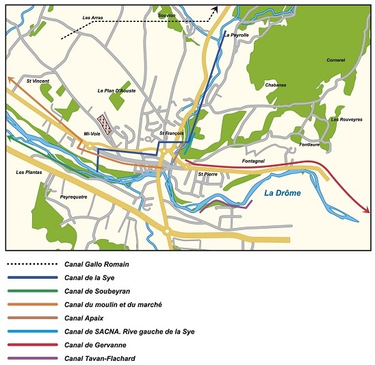 Depuis le Moyen Âge, l’activité économique d’Aouste et Crest était liée au textile, et, ensuite, à la papeterie. Les canaux de la Sye, de la Gervanne et de la Drôme fournissaient l’énergie motrice. Amélioration de la circulation de l’eau et nouvelles turbines (inventées dans la première partie du XIXe siècle) ont permis un fantastique développement économique. Vers 1920, 9 canaux alimentaient localement:une tannerie, une usine à billes, trois papeteries et six usines textile, à Aouste, Crest, Mirabel et Blacons, prés de 1000 emplois dépendaient du bon fonctionnement des canaux.